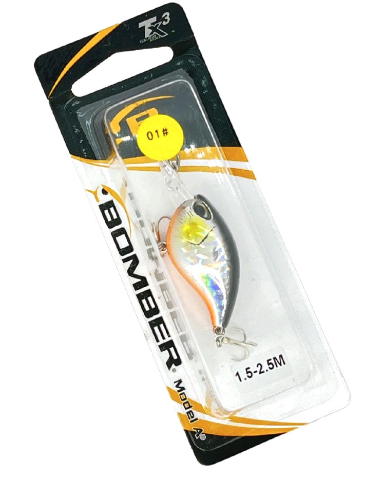 Воблер Columbia Bomber Model A - данный воблер имеет длину 54мм и вес 7гр, заглубление 1,5 - 2,5м. Плавающий крэнк оснащается заглубляющей лопастью, надежной фурнитурой и двумя острыми трехподдевными крючками, а так-же снабжен монтажной петелькой. Своей игрой воблер способен привлечь даже пассивного хищника с больших расстояний, в этом ему так-же помогает погремушка установленая внутри корпуса. В серии представлены вариации с различными окрасками, что дает возможность выбрать приманку под конкретные условия ловли, такие как освещенность и прозрачность воды.
