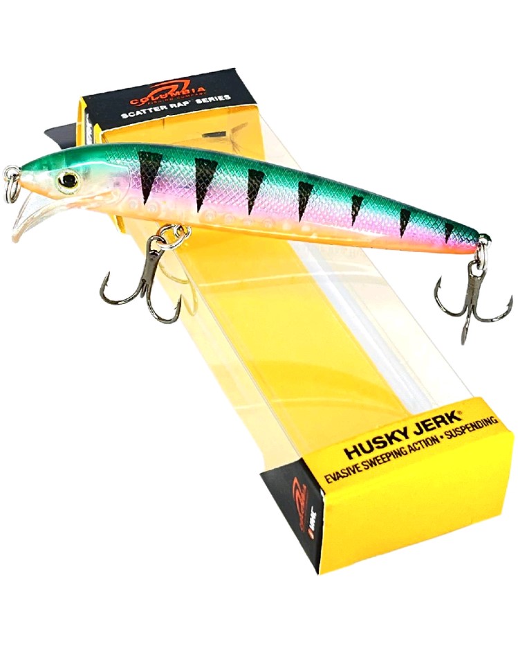 Воблер Columbia Husky Jerk 100S - данный воблер имеет длину 100мм и вес 10гр, заглубление 1,8 - 2,4м. Малек разработаный специально для рывковой проводки. Приманка обладает нейтральной плавучестью, за счет чего на паузах способена достаточно легко удерживаться в воде, не опускаясь на дно и не всплывая на поверхность. Внутри корпуса установлена шумовая камера. Воблер снабжен монтажной петелькой. В серии представлены вариации с различной окраской.