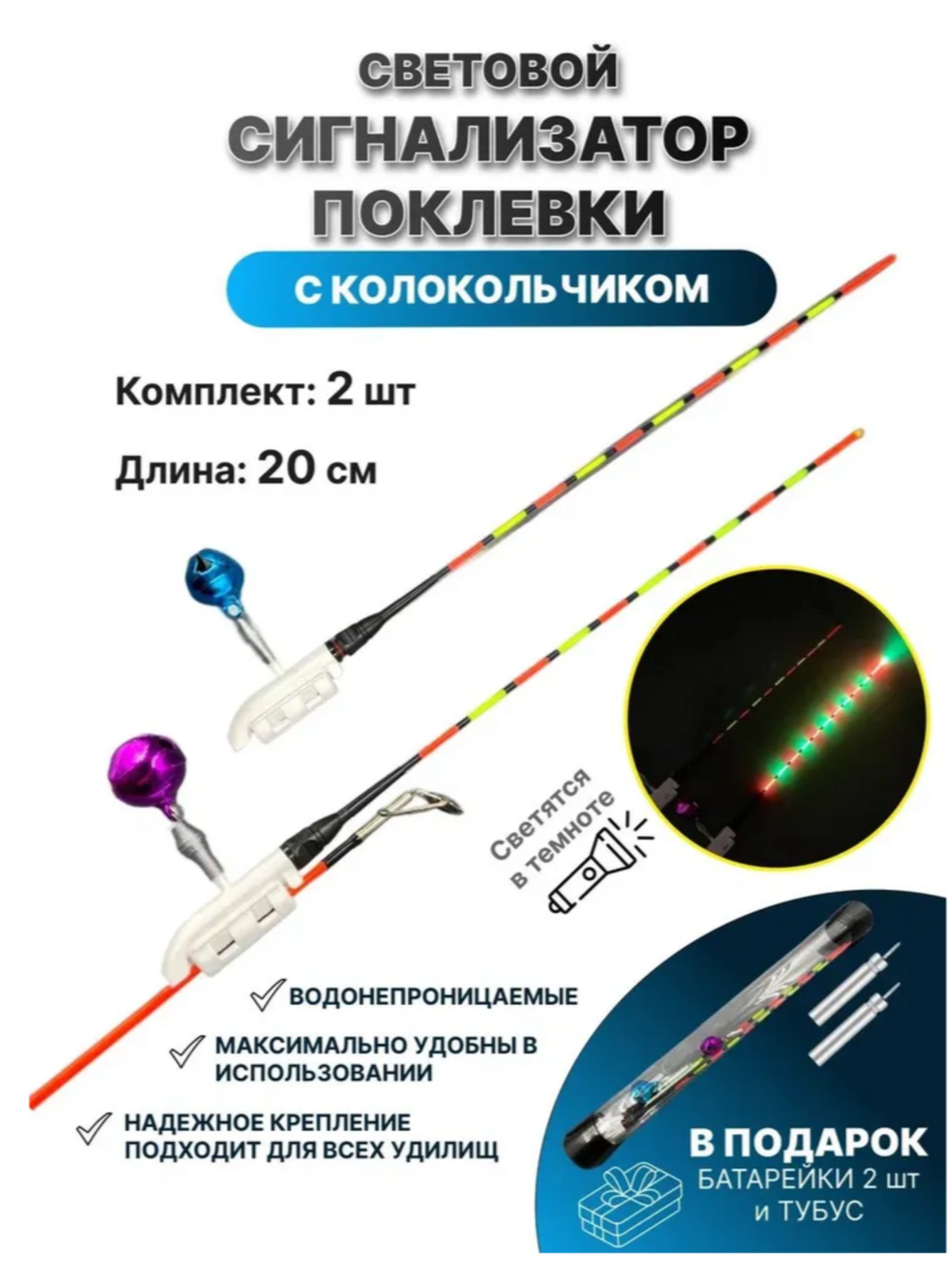 Поплавок для донной удочки - идеально подходит как для опытных рыбаков, так и для новичков. Светящийся наконечник на удилище - это инновационный аксессуар, предназначенный для рыбалки в темное время суток или в условиях плохой видимости. Этот сигнализатор поклевки - настоящая находка для всех, кто ценит комфорт и эффективность во время ночной рыбалки. Электронный сигнализатор для поклевки имеет шумовые бубенцы, для привлечения внимания, и помогают определить даже самые осторожные поклевки. А встроенные светодиоды создают яркое и равномерное свечение, позволяя четко видеть кончик удилища и следить за поклевками. Электронная верхушка на удилище или спиннинг поможет вам мгновенно реагировать на поклевки, ведь встроенные светодиоды создают яркое свечение. Таким образом, в темное время суток вы сможете легко следить за активностью рыбы. Набор светящихся палочек для фидера для ночной рыбалки обеспечивает дополнительное удобство и возможность ловить даже в условиях низкой видимости, а светлячок для фидера станет вашим надежным помощником в этом процессе. Комплект состоит из двух светлячков, что позволяет использовать их одновременно на разных удочках или в качестве запасных. Усовершенствованная конструкция обеспечивает надежную защиту от воды и повреждений, что гарантирует долговечность в использовании. Свингеры для сигнализатора просты в эксплуатации - их легко устанавливать и настраивать. Светящийся наконечник на удилище изготовлен из прочного материала, что гарантирует долговечность и надежность в использовании. Свингеры для рыбалки имеют компактные размеры и легкий вес наконечников, и не создают дополнительной нагрузки на удилище, что особенно важно для продолжительных рыболовных сессий. Дополнительно, бубенцы служат для шумовой индикации поклевки, что увеличивает шансы на успешную ловлю.