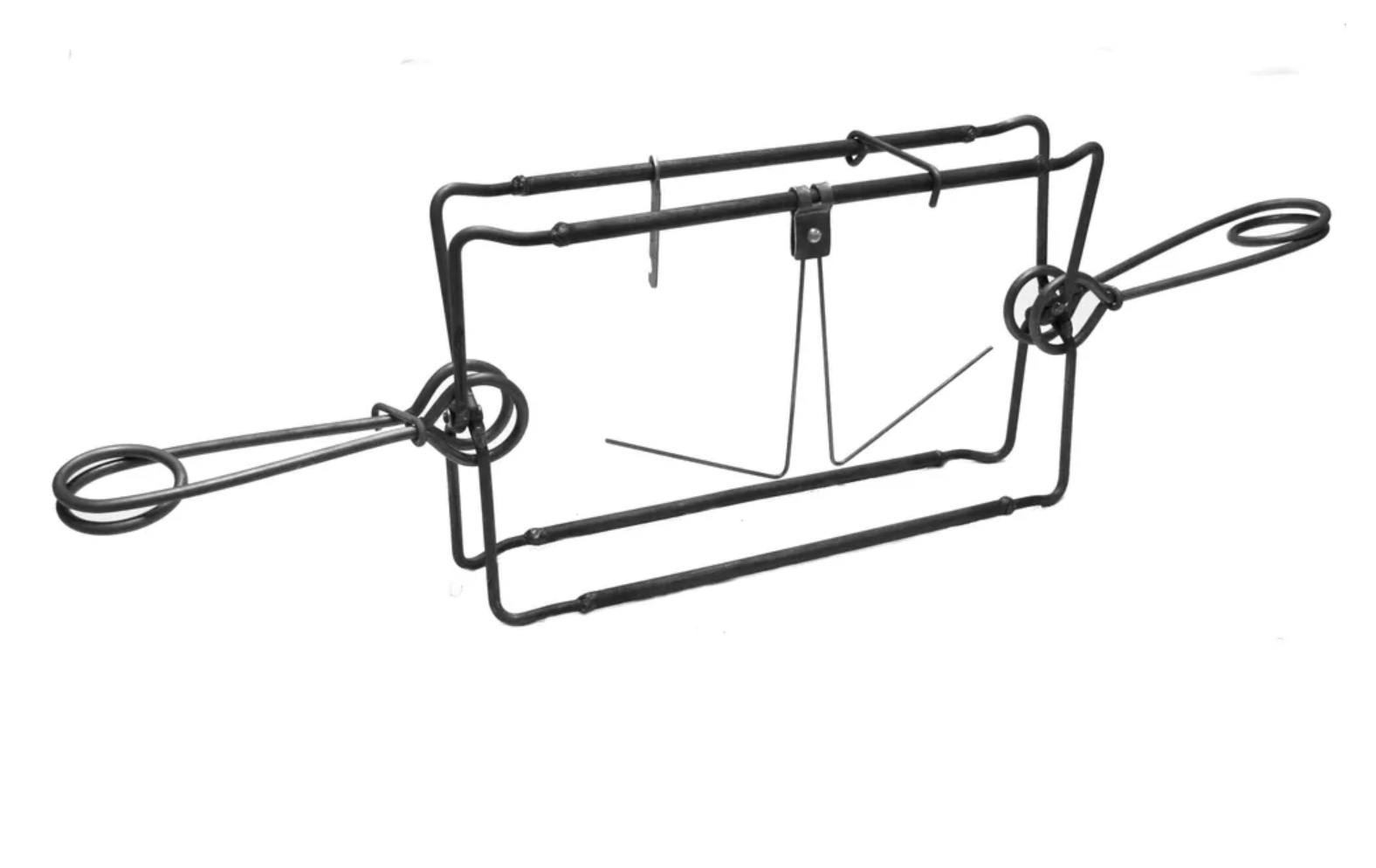 Капкан имеет тугие пружины. Заприте их в сжатом положении крючками, рамки взведённого капкана зафиксируйте предохранительной скобой.