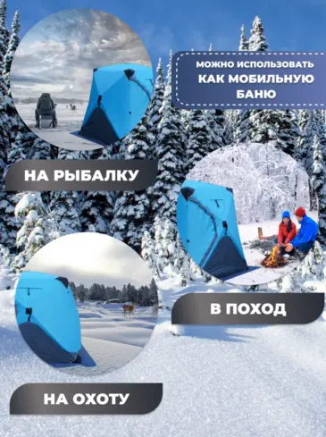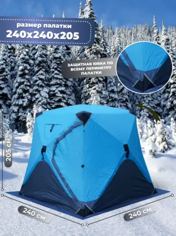 Зимняя утепленная палатка обеспечивает комфортное пребывание на природе и на льду в холодное время года, отлично подойдёт для туризма, отдыха, зимней рыбалки и охоты. Её размер составляет 240 х 240 х 220 см, а материал тента - влагозащитный Oxford 300D с показателем водостойкости 6000 мм. Внутренний слой палатки выполнен из хлопка, благодаря использованию натурального материала достигается максимальная теплоизоляция при минимальном весе.