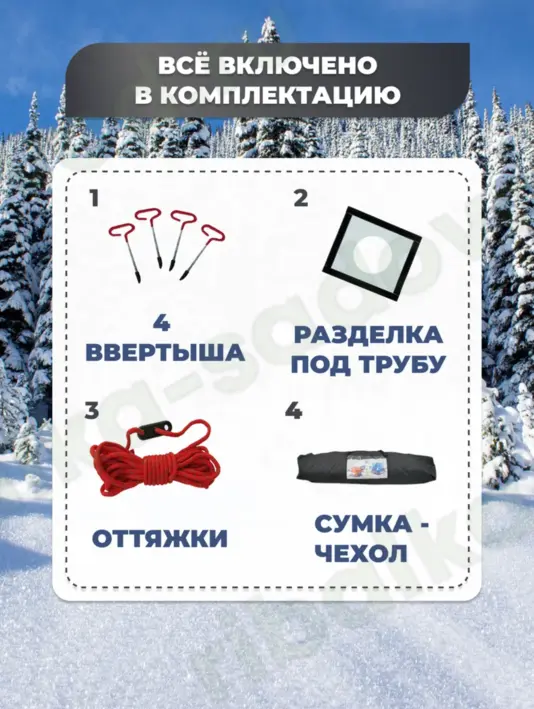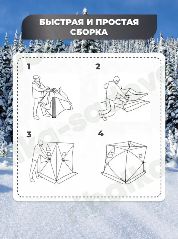 Дуги палатки изготовлены из прочного стеклопластика диаметром 9,5 мм, что обеспечивает устойчивость, надежность и легкость всей конструкции. Одной из особенностей данной зимней палатки является её небольшой вес - всего 14 кг, что значительно облегчает транспортировку. Качественная фурнитура и быстрая сборка (всего несколько минут) делают эту модель особенно привлекательной для любителей зимней рыбалки и походов. Также в комплекте предусмотрены необходимые петли для дополнительных элементов крепления.