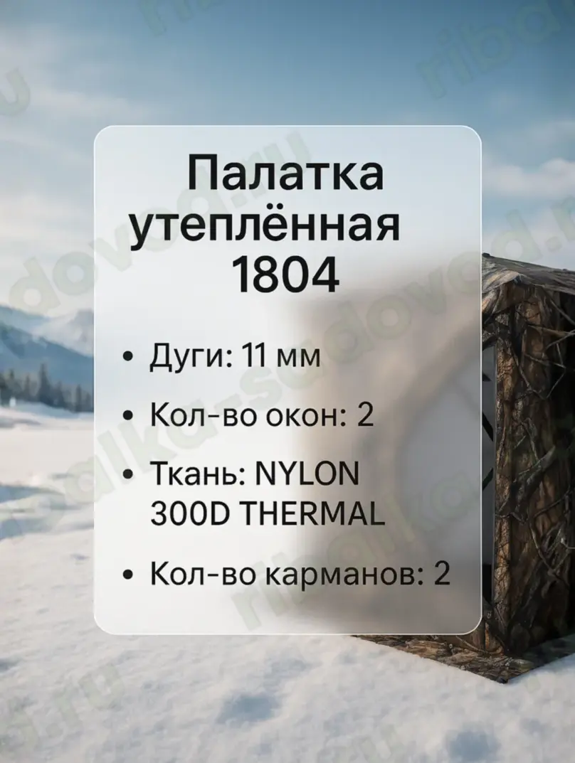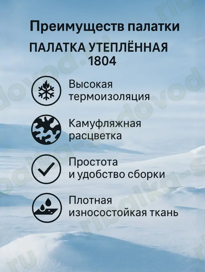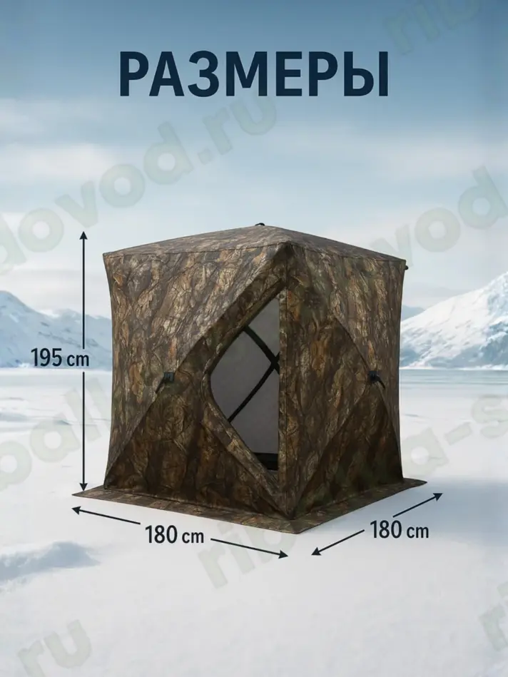 Идеальное решение для активного отдыха, охоты, рыбалки или временного укрытия в зимний период. Палатка обеспечивает тепло, защиту от ветра и влаги благодаря современным утеплительным материалам и прочной конструкции.