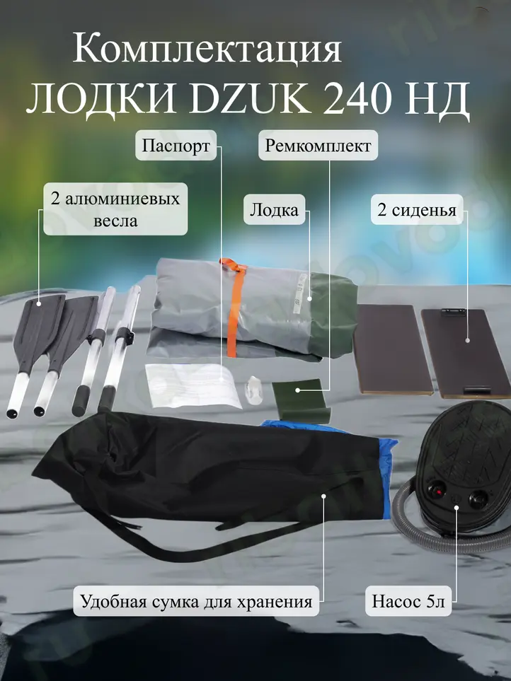 Комплектация лодки DZUK 240 НД включает в себя весла, насос, ремкомплект и сумку для транспортировки. Возможность установки навесного транца позволяет использовать лодку с маломощным лодочным мотором, расширяя диапазон применения и повышая скорость передвижения по воде. Данная модель является оптимальным выбором для рыбалки, охоты и активного отдыха на воде, сочетая в себе компактность, надежность и функциональность.