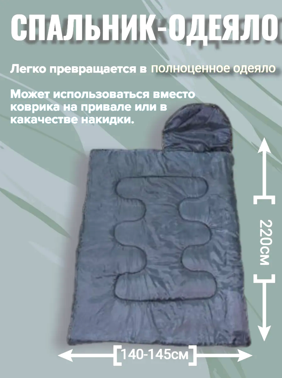 Для любителей спорта и активного отдыха в прохладную погоду важно иметь комфортное место для отдыха. Утепленный спальный мешок-одеяло из влагозащитных материалов легкий и незаменим для туризма, кемпинга и рыбалки. Преимущество спальников-одеял в большем внутреннем пространстве, что актуально для автопутешествий и простых походов. Спальник можно использовать в палатке или гамаке, а молния тип 5 облегчает застегивание внутри. Оснащен капюшоном с утяжкой для сохранения тепла. Подходит для использования в осеннее, весеннее и зимнее время на природе или даче. Спальник ветрозащитный, водонепроницаемый и трехсезонный, подходит для демисезонного и зимнего отдыха. Внешний материал – прочный полиэстер Oxford, наполненный холлофайбером. Размер: 220 см в длину и 140 см в ширину. Упакован в удобный чехол для транспортировки.