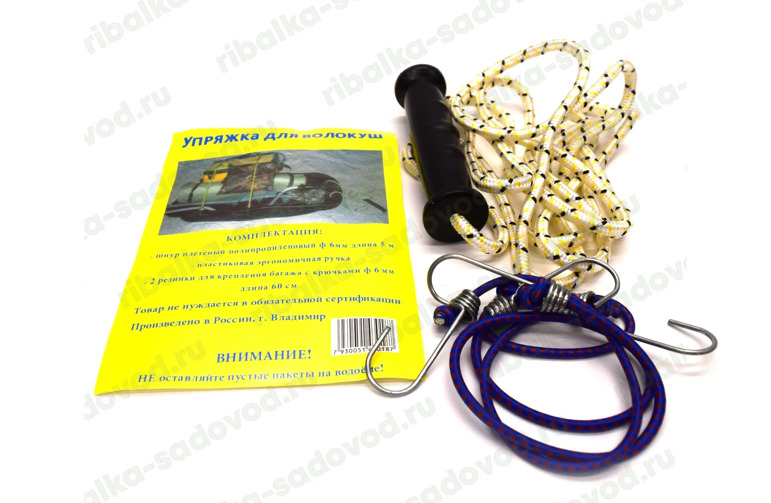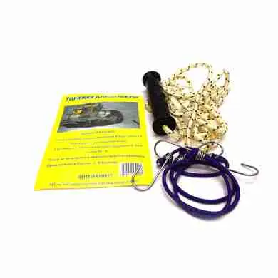 Упряжка транспортная для саней волокуш SV-6 - комплект предназначен для закрепления резинками предметов лежащих на санях волокушах, а так же шнур с ручкой для транспортировки санок. В наборе: плетеный полипропиленовый шнур длиной 5 м., и диаметром 6 мм., ручка на шнуре изготовлена из ударопрочного и морозоустойчивого пластика, так же пара резинок диаметром 6 мм., длиной 60 см., с крючками для крепления к саням из нержавеющей стали. Упряжка для саней станет вашим не заменимым помощником на зимней рыбалке.