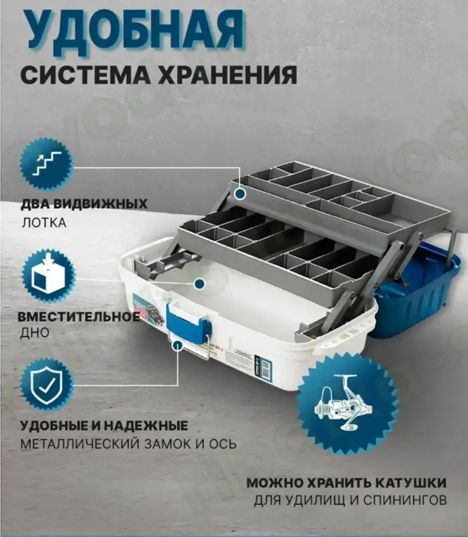 Ящик двухярусный ЯР-2 размером 38*19*18 см выполнен из высококачественного полипропилена, который удароустойчив, влагонепроницаем и устойчив к изменению температур, при этом материал не вступает в химическую реакцию с силиконовыми приманками, твистерами, что делает его незаменимым помощником в любом виде рыбалки. Вертикальная нагрузка на коробку для хранения в 125 кг позволяет использовать его в качестве сидения на рыбалке, не боясь за его целостность. Ручка бокса рыболовного надежная, со специальными фиксаторами с двух сторон, которые исключают возможность прогиба ручки, при полной загрузке ящика снастями. органайзер для инструментов закрывается на прочную защелку с металлической скобой, которая полностью исключает возможность самопроизвольного открытия, а металлические оси обеспечивают надежность крепления и долговечность использования данной модели ящика. При открытии крышка ящика служит опорой, 2 лотка выдвигаются вертикально с помощью крепких рычагов.